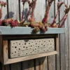 Die Zinkwanne dient als zusätzlicher Schutz vor Regen. Sie wurde professionell gefertigt und mithilfe von abdichtenden Spenglerschrauben sicher am Holzrahmen befestigt. Zwei kleine Öffnungen an den Seiten der Wanne verhindern die Ansammlung von Wasser. Außerdem kann die Zinkwanne mit bienenfreundlichen Pflanzen, wie zum Beispiel Sedumarten, bepflanzt werden.